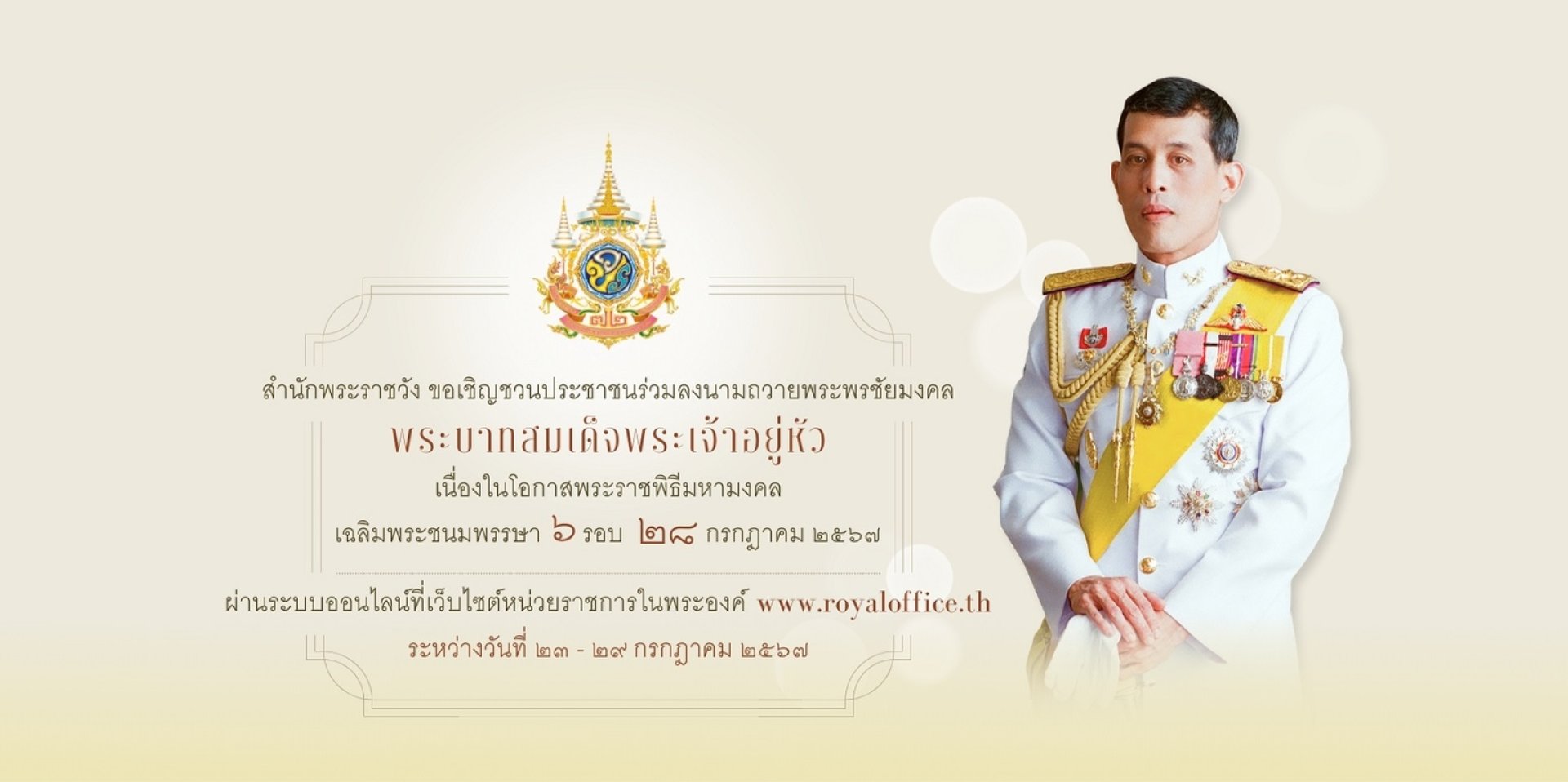 สำนักพระราชวัง ขอเชิญชวนประชาชนร่วมลงนามถวายพระพรชัยมงคลพระบาทสมเด็จพระเจ้าอยู่หัว เนื่องในโอกาสพระราชพิธีมหามงคลเฉลิมพระชนมพรรษา ๖ รอบ ๒๘ กรกฎาคม ๒๕๖๗ ผ่านระบบออนไลน์ ที่เว็บไซต์หน่วยราชการในพระองค์ www.royaloffice.th ระหว่างวันที่ ๒๓ ๒๙ กรกฎาคม ๒๕๖๗